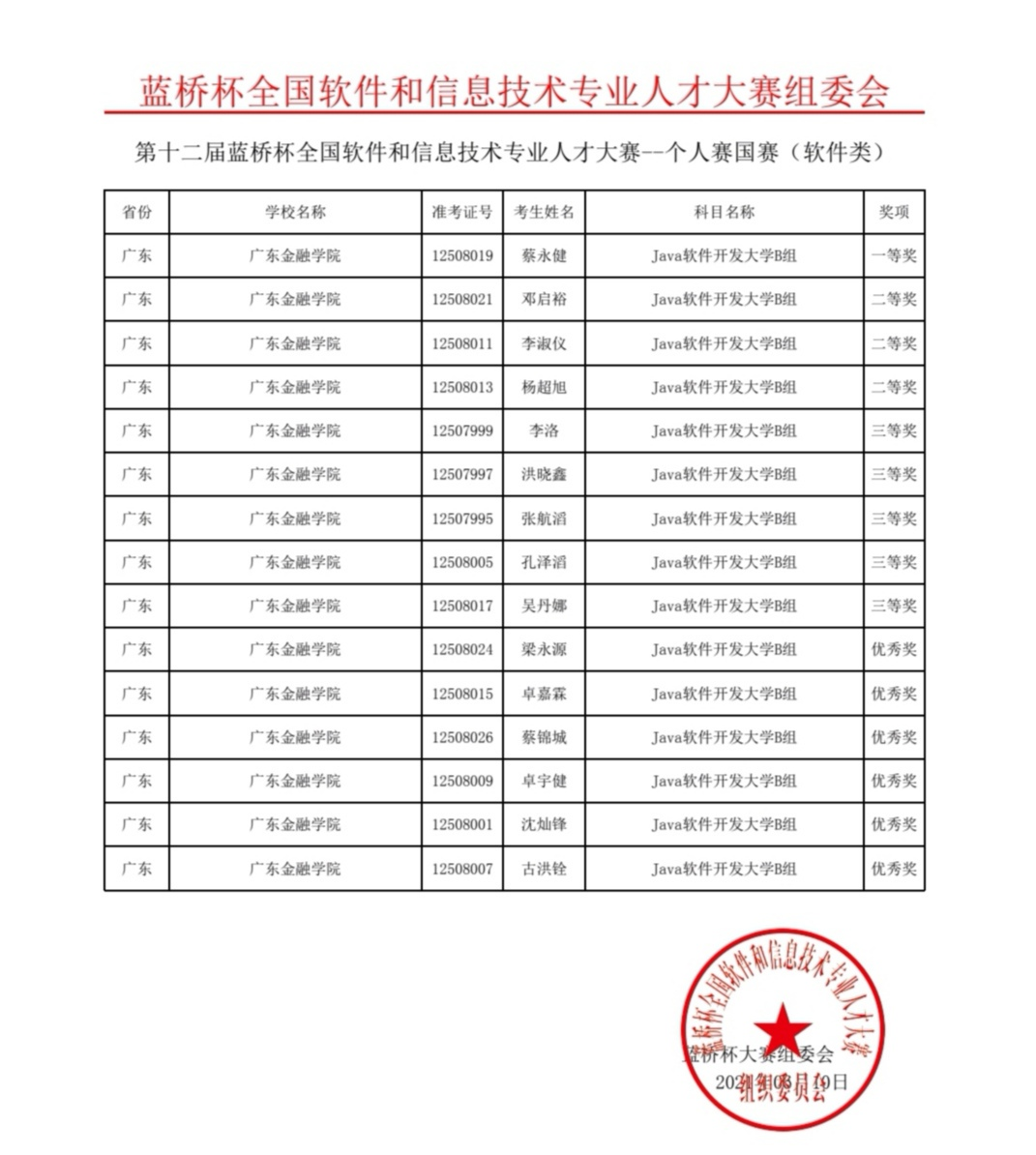 经过激烈角逐,蔡永健同学获Java软件开发大学B组一等奖,邓启裕、李淑仪、杨超旭三位同学获Java软件开发大学B组二等奖,李洛、洪晓鑫、张航滔、孔泽滔、吴丹娜五位同学获Java软件开发大学B组三等奖,梁永源、卓嘉霖、蔡锦城、卓宇健、沈灿锋、古洪铨六位同学获Java软件开发大学B组优秀奖。
