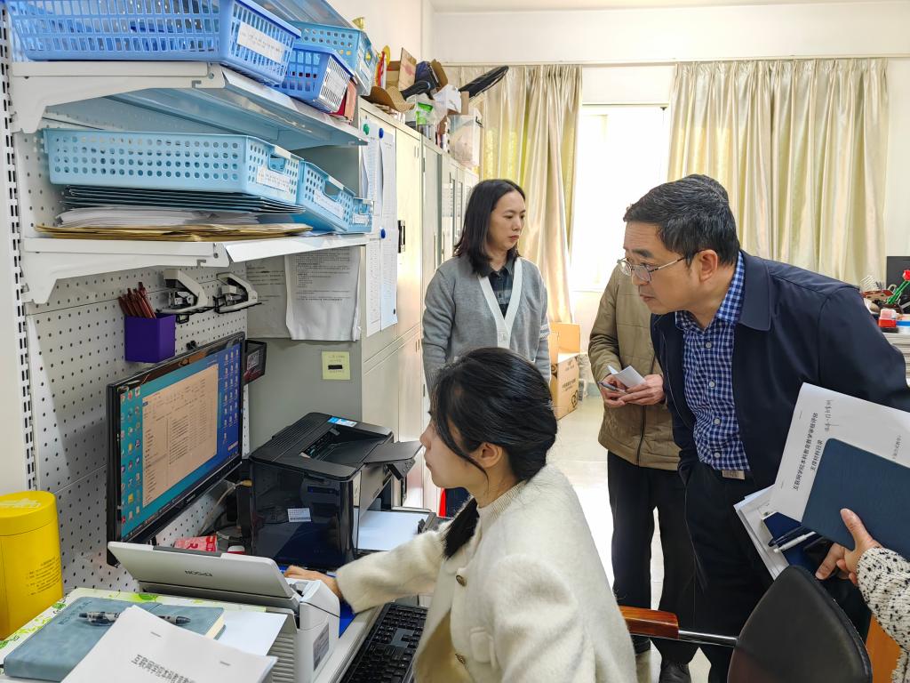 会后,检查组一行前往资料室,检查实习报告、电子试卷等教学档案和归档材料,并对发现的问题进行了现场指导。