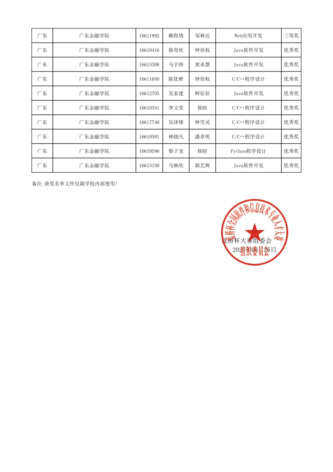 经过激烈角逐,陈嘉亿同学获Python程序设计大学B组全国一等奖,翁博等5名同学获软件类大学B组全国二等奖,陈致昊等13名同学获软件类大学B组全国三等奖,蔡奇欣等9名同学获软件类大学B组全国优秀奖。