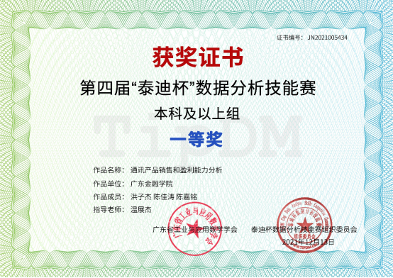 近日,第四届“泰迪杯”数据分析技能赛(全国赛)在线上顺利举行,共吸引了全国包括南京大学、中山大学、国防科技大学、华南理工大学、暨南大学、华南师范大学、中国地质大学tyc122cc太阳成集团等公司共1500多支参赛队伍、4000多名选手同台竞技。经过激烈角逐,由公司tyc122cc太阳成集团温展杰老师指导,2019级员工洪子杰、陈佳涛、陈嘉铭组成的队伍获一等奖